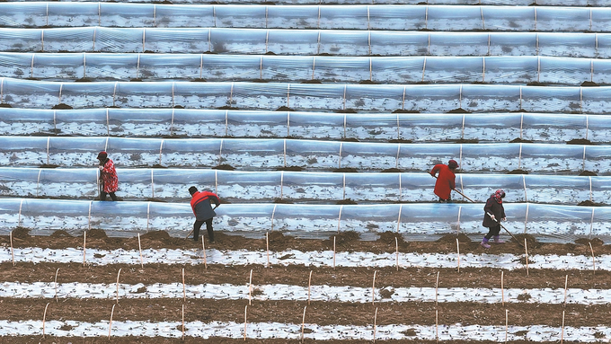 12月24日,淮安市淮阴区高家堰镇紫甘蓝种植基地内一片繁忙景象。工人在为紫甘蓝苗覆盖地膜,为幼苗穿上保暖“冬衣”,为明年丰产丰收筑牢基础。 刘须连 摄 (视觉江苏网供图)