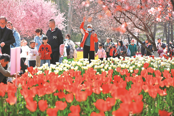 3月27日,游客在淮安市钵池山公园第十三届郁金香花展观赏拍照。本届花展郁金香种植面积达2010平方米,共计8.1万株,各色郁金香缤纷绽放,与同期盛开的二月兰、紫叶李交相辉映,呈现出春风和煦、花海烂漫的唯美景致。 周长国 摄 (视觉江苏网供图)
