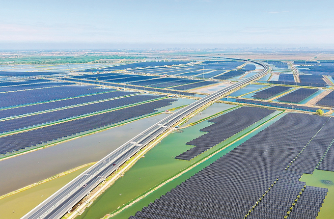 近年来,连云港市加快发展光伏绿色清洁能源,推广“渔光互补”光伏项目,在滩涂和坑塘洼地上发展光伏绿色清洁能源,形成“水下养鱼,水上发电”的高效养殖模式,实现绿色发电与生态养殖的协同增效,为能源结构优化和绿色转型注入强劲动力。图为4月14日拍摄的位于连云港市赣榆区墩尚镇的“渔光互补”光伏工程。 王健民 摄 (视觉江苏网供图)