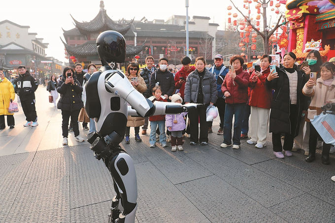 春节临近,各类机器人“组团”亮相多元生活场景,点亮江苏别样年味。图为1月27日,南京一款身高170厘米、重140斤的智能机器人亮相夫子庙,它的身影瞬间吸引了游客驻足围观。