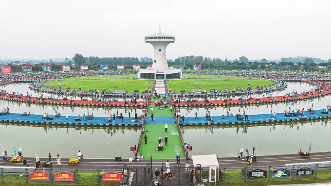 10月4日,泗洪县“石川”杯第五届塘三彩休闲垂钓赛在该县国际大圆塘举行,吸引全国各地的534名垂钓爱好者同塘竞技。 李佳 摄 (视觉江苏网供图)