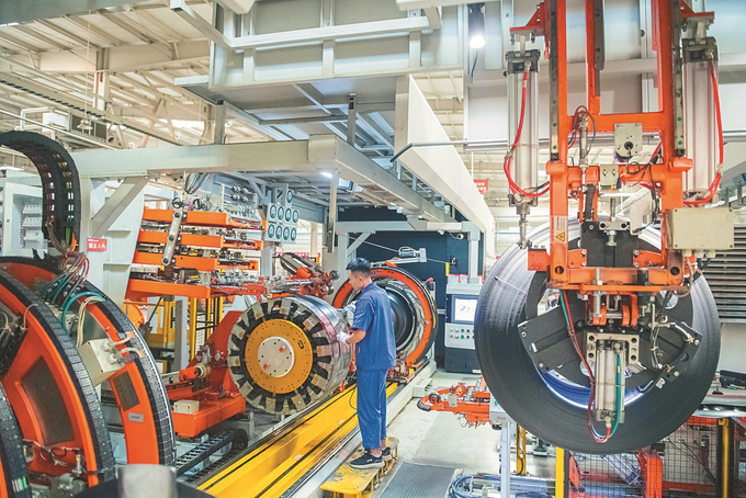 10月9日是国庆假期后的第一个工作日,宿迁市宿豫区企业产销两旺。图为江苏三元轮胎有限公司智能化生产车间里,工人在生产线上赶制出口订单。 徐江海 摄 (视觉江苏网供图)