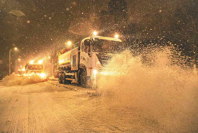 1月19日晚,宿迁市宿城区城管局组织清雪车辆对河滨街道路段连夜开展清雪作业。 徐江海 顾海涛 摄 (视觉江苏网供图)
