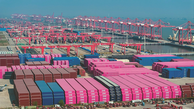 今年一季度,苏州港完成集装箱吞吐量251.4万标箱、同比增长4.5%,完成外贸货物吞吐量5265万吨、同比增长9.8%。图为4月20日,苏州港太仓港区集装箱码头作业繁忙有序。计海新 摄 (视觉江苏网供图)