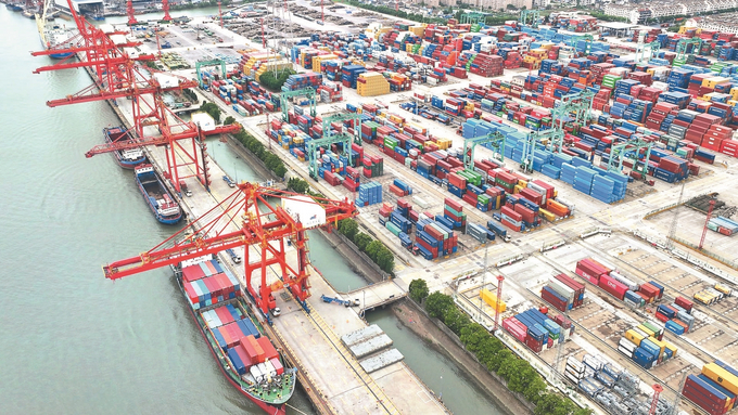 苏州海关6月19日发布数据,今年1至5月,苏州市货物贸易进出口总值10761.5亿元,同比增长6.2%,占全国进出口总值的6%。 图为6月20日,苏州港张家港港区集装箱码头一片忙碌。 施柏荣 摄 (视觉江苏网供图)