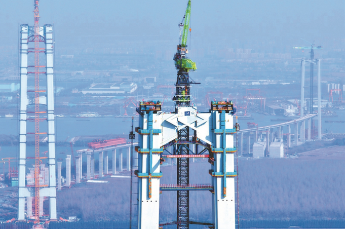 12月1日上午,张靖皋长江大桥南航道桥南主塔上横梁完成“云端合龙”,标志着该大桥主塔主体工程全面完工,由下部结构施工转入上部结构施工新阶段。 陆严苏 吴树建 摄 (视觉江苏网供图)