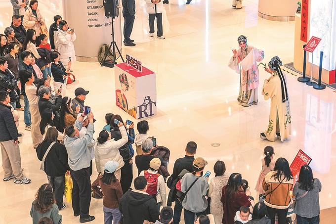 2月13日,苏州工业园区,一场昆曲快闪表演在苏州中心上演,引来市民群众驻足观看。 张锋 摄(视觉江苏网供图)
