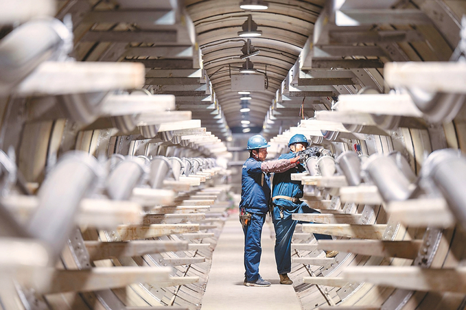 十一月二十四日,施工人员在无锡市新吴区后宅东路地下隧道中安装二百二十千伏电缆抱箍。为适应城市快速发展,国网无锡供电公司加力实施“电缆入地”工程,节省改善城市空间、提升城市承载能力。潘正光 摄 (视觉江苏网供图)
