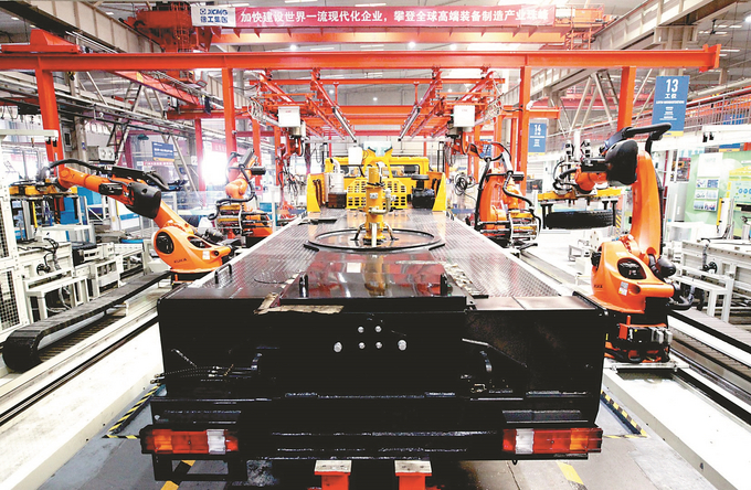 3月23日,在徐工重型中小吨位轮式起重机装配生产线上,关节机器人在安装轮胎。近年来,徐工集团全面推进“智改数转网联”,以科技创新塑造产业发展新优势。 蒯创 摄 (视觉江苏网供图)