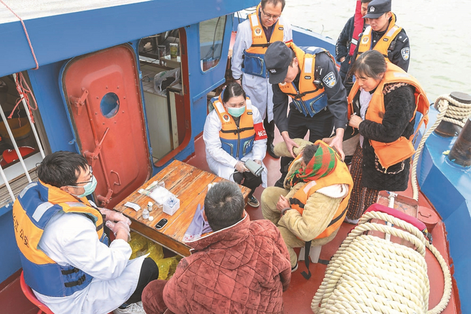 1月29日,长航公安局镇江分局镇江派出所联合镇江市第一人民医院经开分院,组织“长江义警”中的医护力量,在长江镇江段经开区水域开展“船头义诊”活动。 濮方杰 摄 (视觉江苏网供图)