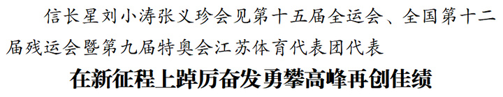 本报讯 (记者 黄伟) 1月7日,省委书记、省人大常委会主任信长星,省长刘小涛,省政协主席张义珍在南京会见第十五届全运会、全国第十二届残运会暨第九届特奥会江苏体育代表团代表,代表省委、省人大常委会、省政府、省政协向大家取得的优异成绩表示祝贺,向全省广大体育工作者、残疾人工作者致以诚挚慰问。