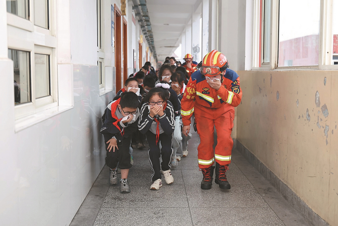 10月13日,淮安市洪泽第二实验小学联合区消防救援大队开展“国际减灾日”主题教育活动。图为消防员和学生正在进行火灾逃生演练。 殷潮 摄 (视觉江苏网供图)