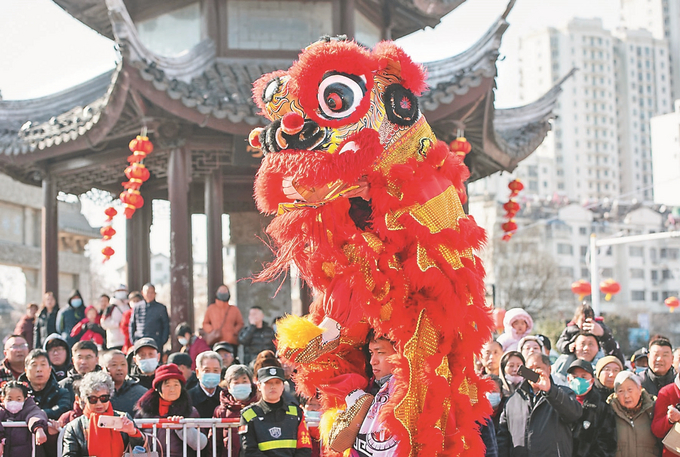 2月17日,民间艺人在淮安市清江浦区里运河文化长廊进行舞狮舞龙表演。 贺敬华 摄