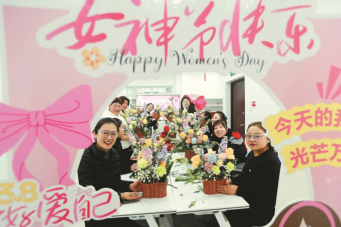 3月7日,连云港市连云区墟沟街道滨海社区举办“指尖绽芳华 喜迎‘三八’节”活动,现场邀请插花技师指导,新就业群体女性代表、女职工聚集在一起,互相交流插花艺术,展示插花才艺,在溢满馨香和轻松愉快的氛围中喜迎“三八”国际妇女节的到来。 王春 李倩倩 摄(视觉江苏网供图)