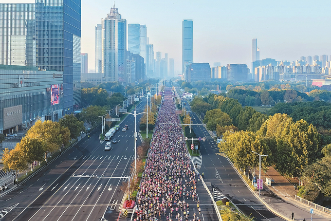 11月16日上午,南京银行·2025南京马拉松暨大运河马拉松系列赛(南京站)在南京奥体中心鸣枪开跑,24000名跑者齐聚金陵,用脚步丈量城市,在42.195公里的旅程中,感受一场身体与心灵的高峰体验。 本报记者 蒋文超 摄