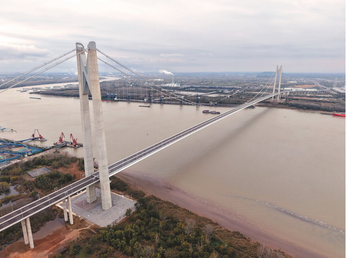 目前国内第一、世界第三大跨度单跨吊钢箱梁悬索桥——南京新生圩长江大桥,即将建成通车。图为十一月十七日航拍大桥雄姿。 本报记者 宋宁 摄