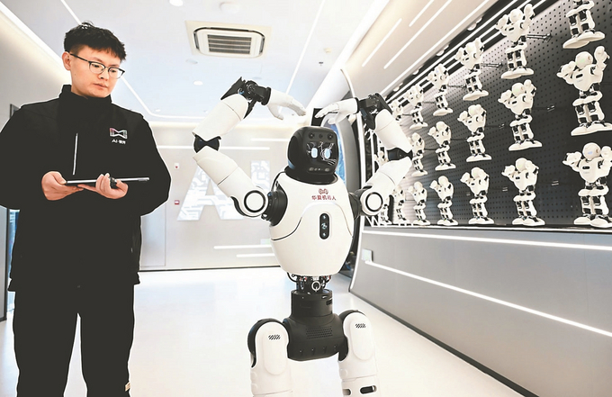 中国(南京)软件谷人工智能生态街区近日开街。图为12月4日,在“AI·模坊”智能体集散中心,一款华夏机器人对着镜头比心。 本报记者 吴胜 摄