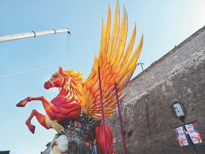 一月十一日,老门东城墙下的巨型飞马灯正在安装翅膀。十五米高、二十八米宽的马年生肖灯是此次第四十届秦淮灯会最大亮点之一。 本报记者 宋宁 摄