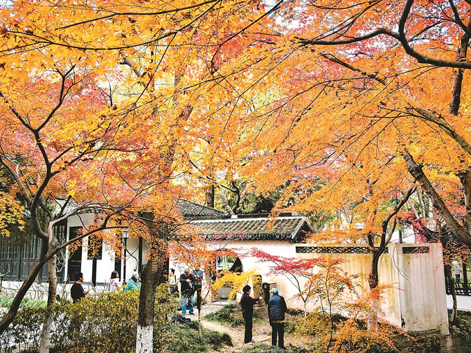 11月30日,南通狼山景区北麓园的枫叶到了最佳观赏季,色彩斑斓,宛如秀美的画卷,吸引游人纷纷前来拍照打卡。图为游客在狼山北麓园游园赏景。 瞿德均 摄 (视觉江苏网供图)