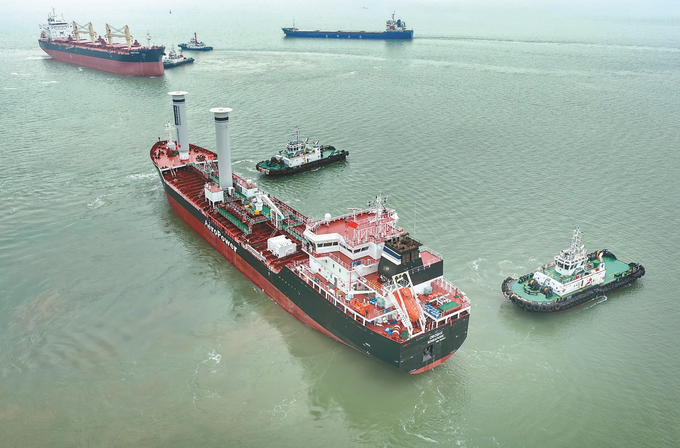 2月10日,在南通海关的监管下,一艘配备两根银色旋筒风帆的新造节能环保型化学品船在海门东灶港码头开赴欧洲。该船采用绿色风帆助推技术,能够根据风向、风速等气象条件自动调节姿态与转速,减少主机负载,可为船舶航行节省最高约10%的燃油消耗。 许丛军 摄(视觉江苏网供图)
