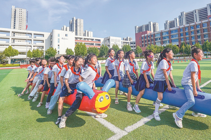 近日,宿迁经济技术开发区青海湖路小学的学生们在“每天一节体育课”上快乐运动、强身健体。 陈少帅 摄 (视觉江苏网供图)