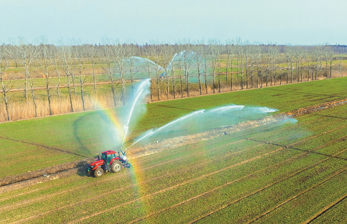 为缓解旱情,泗洪县龙集镇种粮大户用大型机械对麦田进行灌溉作业。张连华 摄