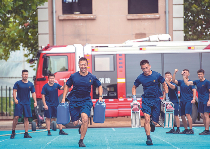 连日来,宿迁消防救援支队组织开展综合体能、架设15米金属拉梯操、廊式火灾扑救操等训练,进一步提升消防员实战水平,磨砺在高温天气下应急处突、连续作战的能力。图为8月4日,宿迁经济技术开发区消防救援大队训练场,消防员正在开展综合体技能训练。 徐江海 摄(视觉江苏网供图)