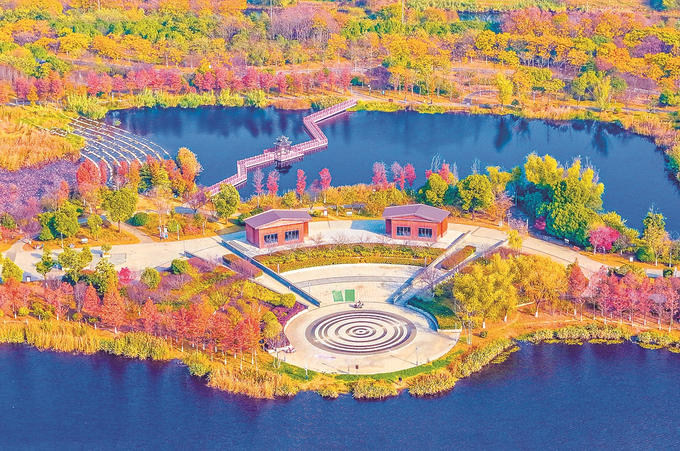 11月24日,泗洪县重岗街道玉珠湖生态公园初冬景致色彩斑斓,宛如童话世界,吸引游人前来游览休闲。 张连华 摄(视觉江苏网供图)