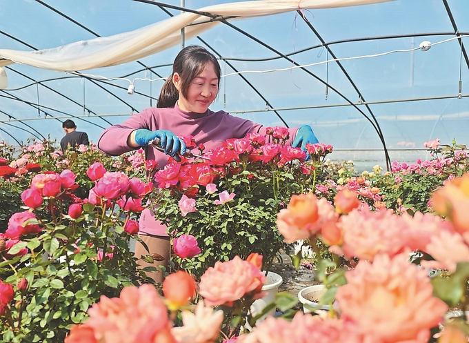 4月14日,在沭阳县新河镇堰头村月季花基地,花农对树桩月季进行浇水、剪枝、定型等管理。 丁华明 摄 (视觉江苏网供图)