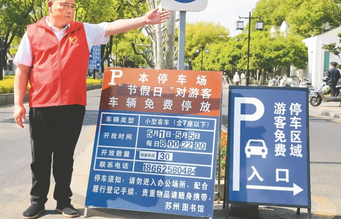 5月1日,苏州市356家机关企事业单位内部停车场免费开放。图为身着红马甲的志愿者正在引导汽车通行。 陈弋 摄