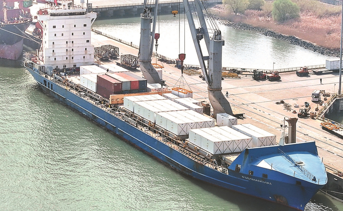3月28日,张家港港新重装码头一片忙碌,船舶正有序装载电力设备。本次装载的储能柜、变压器、变电器等,货物总值近4亿元人民币,将出口至阿曼,用于当地大型电力工程建设。 施柏荣 张边轩 摄 (视觉江苏网供图)