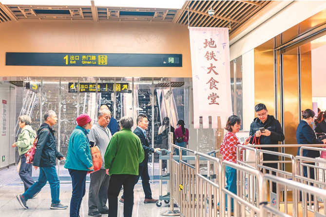 3月29日,苏州地铁运营的第三家大食堂——星连·拙政园苏博大食堂在地铁6号线拙政园苏博站开门迎客。大食堂位于拙政园苏博站站厅1号出口附近,面积约700平方米,可容纳100余人同时用餐,极大方便了市民游客的就餐需要。图为市民游客前来用餐。 张锋 摄 (视觉江苏网供图)