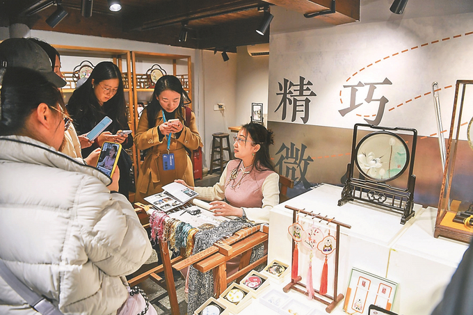 28日晚,无锡荡口古镇举办的“家门口享非遗”活动开启另一种江南风情。评弹《莺莺操琴》、无锡的“小热昏”吸引路人驻足;仓河南街义盛桥上,一对青年男女演员正在表演锡剧《珍珠塔》选段,引来路人纷纷举起手机拍摄。无锡精微绣展示厅,非遗代表性传承人介绍一根蚕丝最多可劈成128根细丝,令上海电视台融媒体中心记者丁桃惊叹“不可思议”;无锡留青竹刻展厅,非遗代表性传承人乔瑜对比无锡、常州留青竹刻工艺;无锡纸马展示厅,非遗代表性传承人陶晓梦介绍传统题材“五路大神”和她开发的“Q版”纸马“魁星点斗”的异同。“这一路走来,深切感受到‘水韵江苏’的烟火气。”中国社会科学报记者吴楠感叹。
