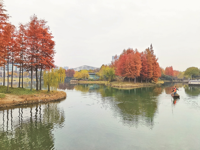 冬日的无锡尚贤河湿地公园,水杉、落羽杉、池杉相映成趣。从蓝藻高发、气味刺鼻的“边角地”,到拥有上百种植被的城市“绿肺”,这里经历了先治水、再种树、后成景的发展历程,水质常年保持Ⅲ类。 本报记者 吴琼 摄
