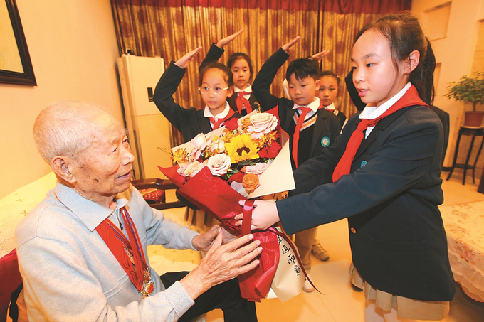 十月十四日,新沂海门中学附属学校开展“致敬最可爱的人”寻访身边抗美援朝老兵活动。图为九十六岁的抗美援朝老兵朱作文给少先队员讲述上甘岭战役的战斗故事。 蒯创 摄 (视觉江苏网供图)