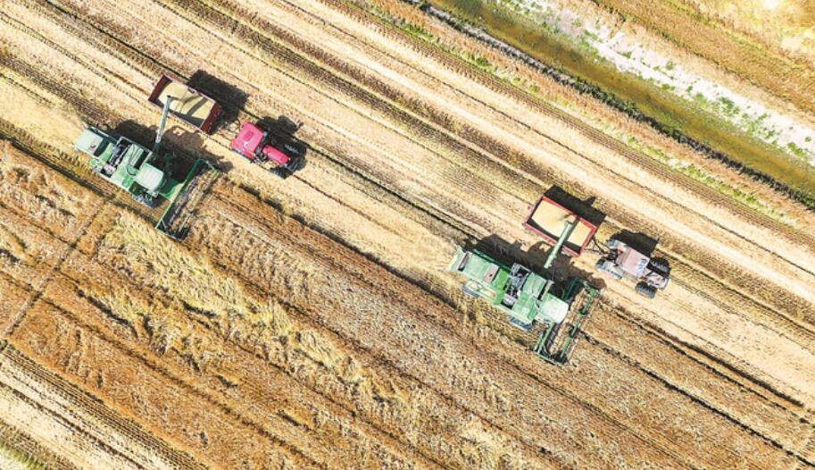 5月22日,大型联合收割机驶入射阳县新洋农场新中生产区13大队的高标准农田,对成熟的大麦开展机收作业,开启了夏收“第一镰”。 张伟生 摄 (视觉江苏网供图)