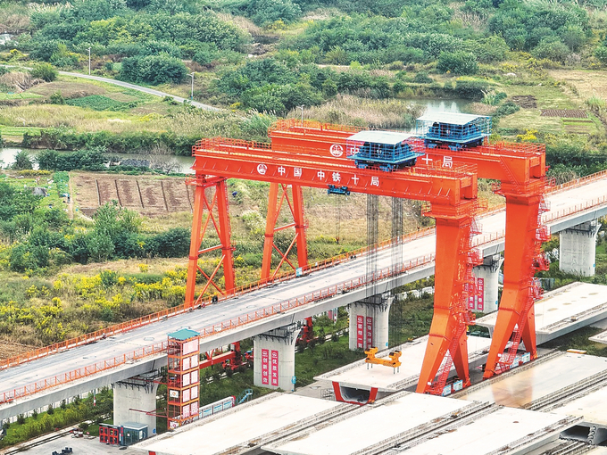 10月21日,航拍中铁十局承建的沪渝蓉高铁扬州制梁场,该梁场870榀箱梁已于近日全部完成预制,为扬州境内预制箱梁数量之最。作为国家“八纵八横”高铁网沿江通道关键组成,沪渝蓉高铁扬州段将在今年11月下旬完成全部架梁任务,其建成对推动长江经济带发展、优化区域综合交通结构意义重大。 通讯员 杨旭强 本报记者 赵亚玲 摄(视觉江苏网供图)