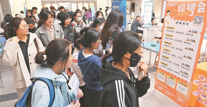 4月10日,连云港市举办“乡约山海 就在港城”2026年毕业生实习就业双选会,100多家优质企业携3000多个岗位,吸引众多毕业生求职。图为毕业生正在咨询了解岗位情况。 耿玉和 摄 (视觉江苏网供图)