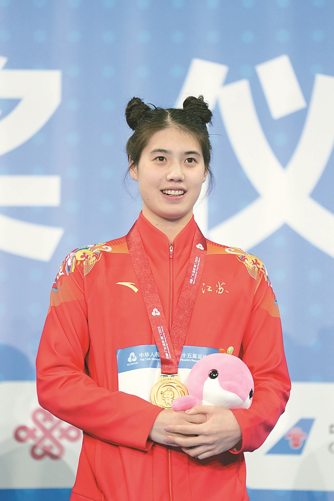 11月16日,获得冠军的江苏队选手张雨霏在颁奖仪式上。(新华社发)