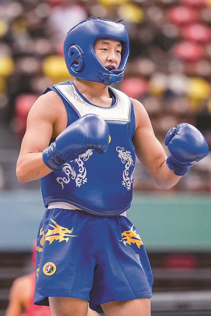 11月15日,江苏队选手唐思硕在武术散打比赛中。 (新华社发)