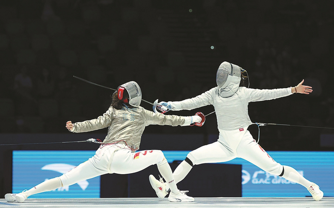 江苏运动员杨恒郁(左)15:13战胜队友傅颖(右)获得女子佩剑个人金牌。本报记者 万程鹏 摄