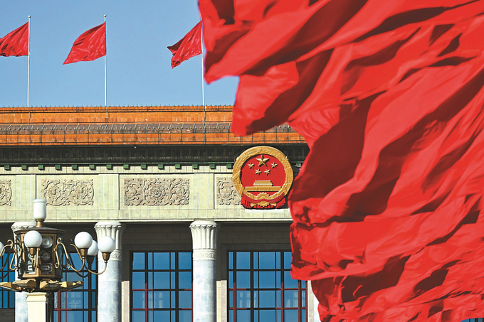 北京人民大会堂,国徽在鲜艳的红旗映衬下熠熠生辉。 本报记者 吴胜 万程鹏 摄
