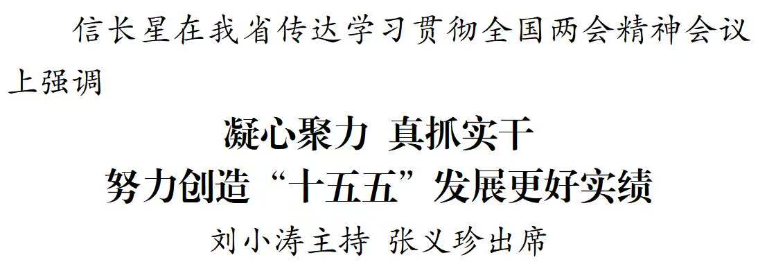本报讯 (记者 黄伟) 3月13日,我省召开传达学习贯彻全国两会精神会议。省委书记、省人大常委会主任信长星传达习近平总书记参加十四届全国人大四次会议江苏代表团审议等在全国两会期间的重要讲话精神,就学习贯彻作出部署。省长刘小涛主持会议。省政协主席张义珍传达全国政协十四届四次会议精神,省人大常委会常务副主任樊金龙传达十四届全国人大四次会议精神。